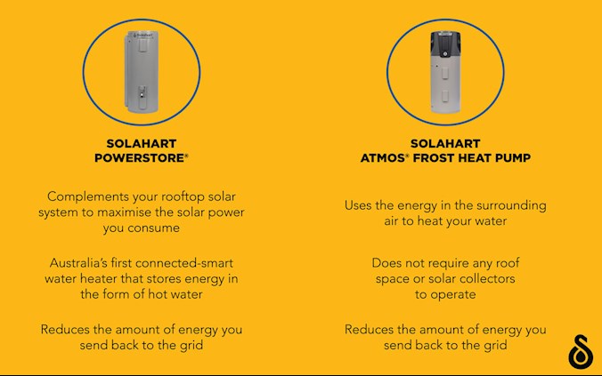 The difference between the two systems is how they produce hot water. Solahart PowerStore®, Australia’s first smart-connected electric water heater, is designed to use the excess power from your home’s solar PV panels to heat water. A heat pump is designed to use the temperature in the surrounding air to heat the water in the tank and does not require solar panels or a PV system to operate.